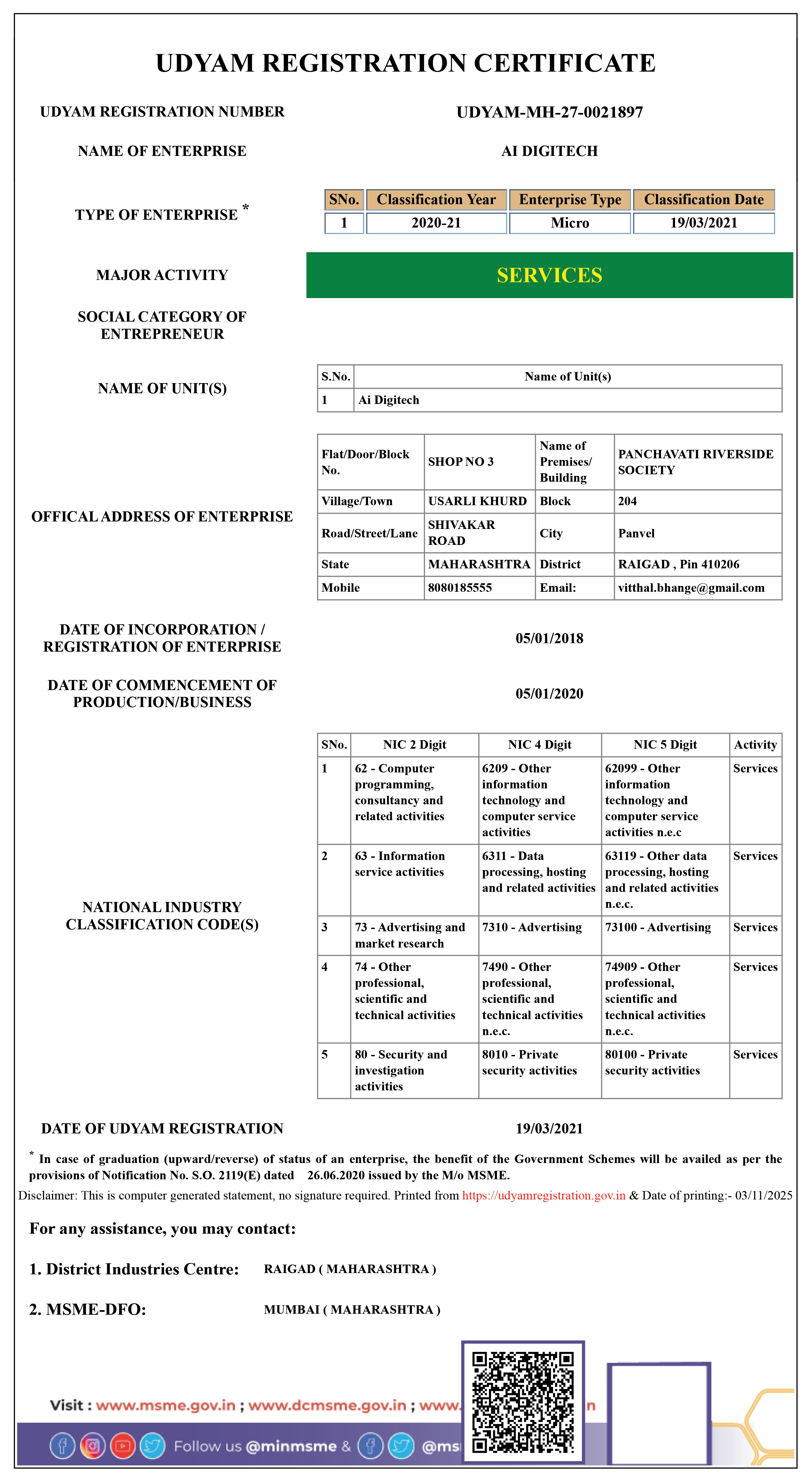 The Micro, Small and Medium Enterprises Development (MSMED) Act, 2006 provides for facilitating the promotion and development and enhancing the competitiveness of micro, small and medium enterprises. Our MSME registration demonstrates our commitment to quality and compliance with government standards.